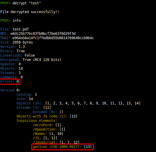 - Nuevo comando decrypt: Normalmente cuando se envía un archivo PDF malicioso mediante correo electrónico y éste se encuentra cifrado no hace falta una contraseña para abrirlo. Adobe Reader hace uso del password en blanco por defecto como primer recurso y con esto suele valer, sin necesidad de interacción por parte de la víctima. Sin embargo, se han visto algunos casos donde se incluye la contraseña en el cuerpo del e-mail, por lo que se hacía necesario un comando para añadir esta información al análisis. De esta forma, cuando peepdf analiza un documento protegido con contraseña muestra un error si ésta debe ser introducida manualmente. Cuando se introduce la contraseña con el comando decrypt se realiza de nuevo el análisis, pudiendo ver esta vez todo el contenido descifrado de los objetos.