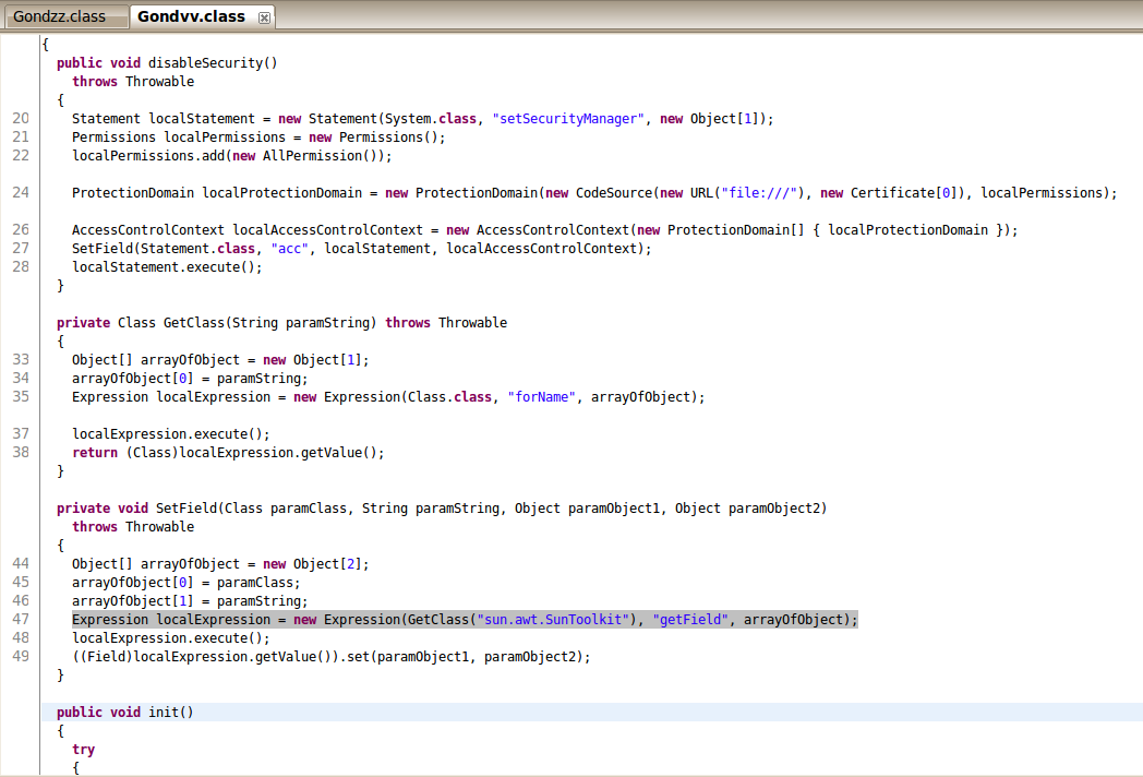 El exploit se ejecuta a través de las clases contenidas en un applet. En el ataque mencionado por FireEye para llegar a este applet se tenían que pasar por diferentes etapas de Javascript ofuscado con la versión 0.44 del ofuscador Dadong's JSXX (“Encrypted by Dadong's JSXX 0.44 VIP” aparece en el código). Tanto en la llamada al applet como en las propias clases de Java (Gondvv.class y Gondzz.class) hay referencias a palabras en chino, que podría ser la nacionalidad de los atacantes (o un simple engaño):
